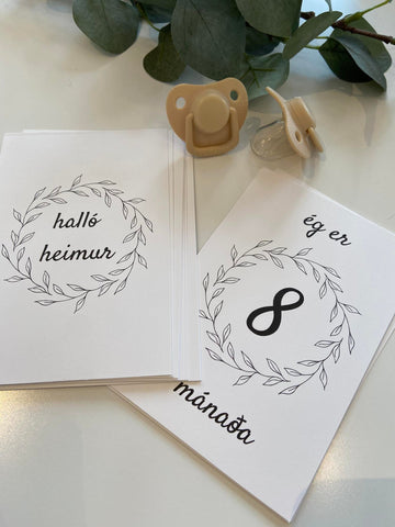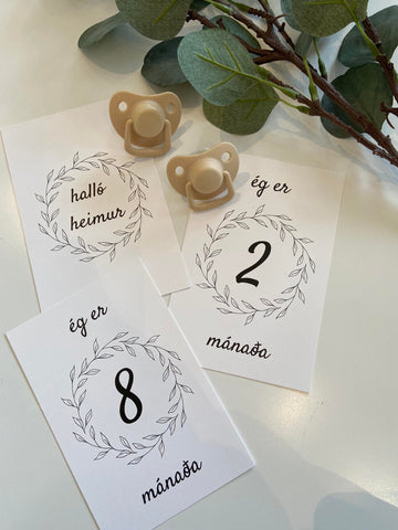 Mánaðarspjöldin eru notuð fyrir mánaðarlega myndatöku af barninu frá fæðingu að 1 árs aldri. Spjöldin eru 13 talsins: Halló heimur, 1-11 mánaða og 1 árs. Spjöldin eru auð að aftan...