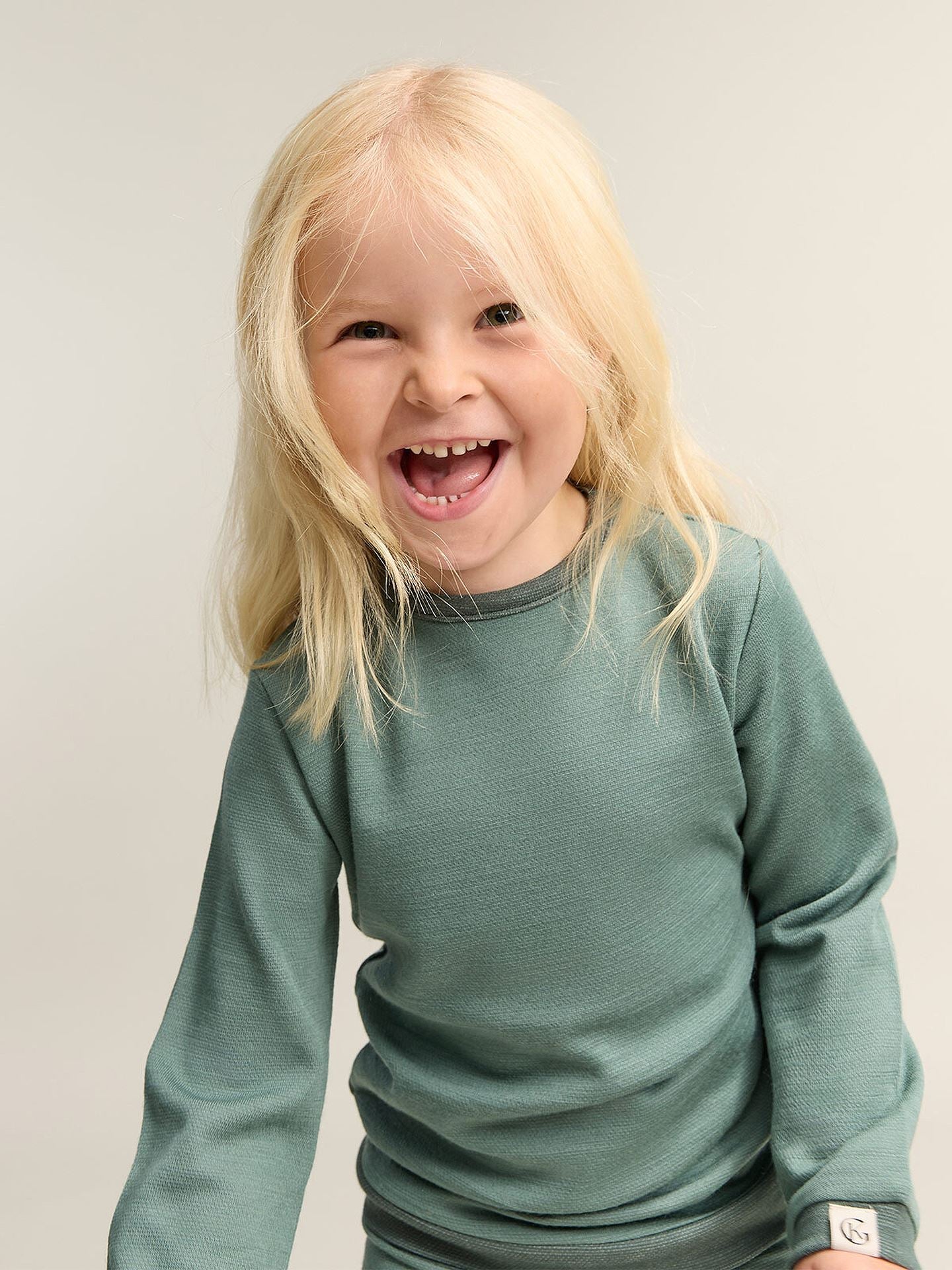 Mögulega mýksta ull í heimi! Grana línan er létt, mjúk og andar vel. Hún er hið fullkomna innsta eða miðlag á veturna. Flíkin er úr merino ull að utan og viskós úr bambus að innan, og er því mjög hlý og þægileg fyrir barnið.