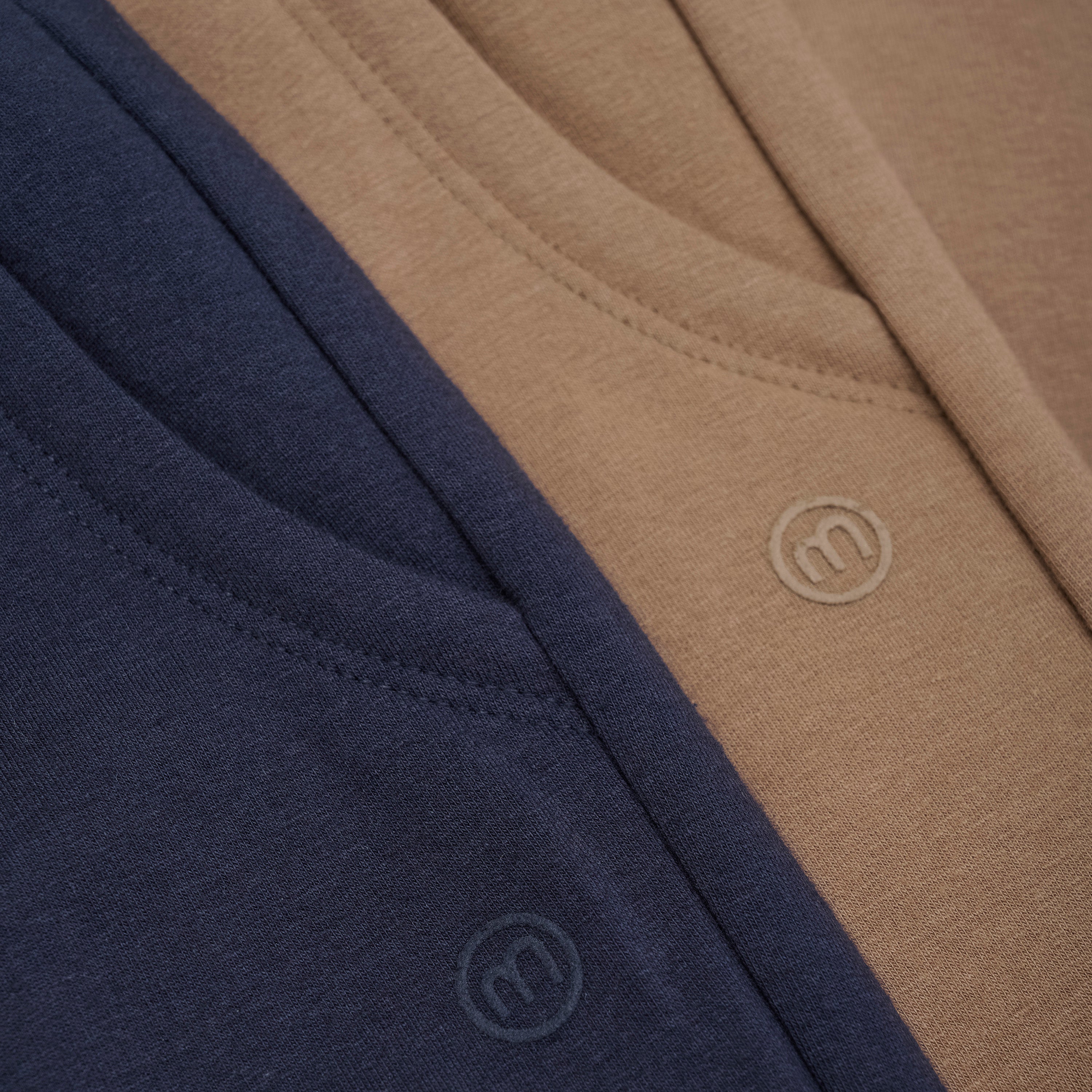 Jogging buxur úr mjúku og teygjanlegu bómullarefni. 2 buxur í pakka, aðrar bláar og hinar brúnar. Band í mitti og stillanlegt mitti.