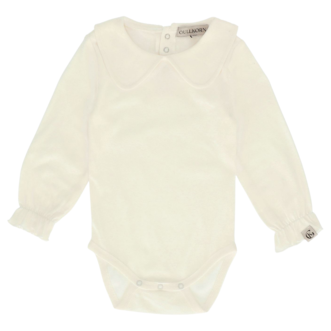 Falleg og mjúk samfella með sparilegum kraga og pífum fremst á ermum. Tilvalin fyrir fínni tilefni. Bómullarefnið er létt, þægilegt, andar vel og hefur mikla teygju. Smellur aftan á hálsmáli.