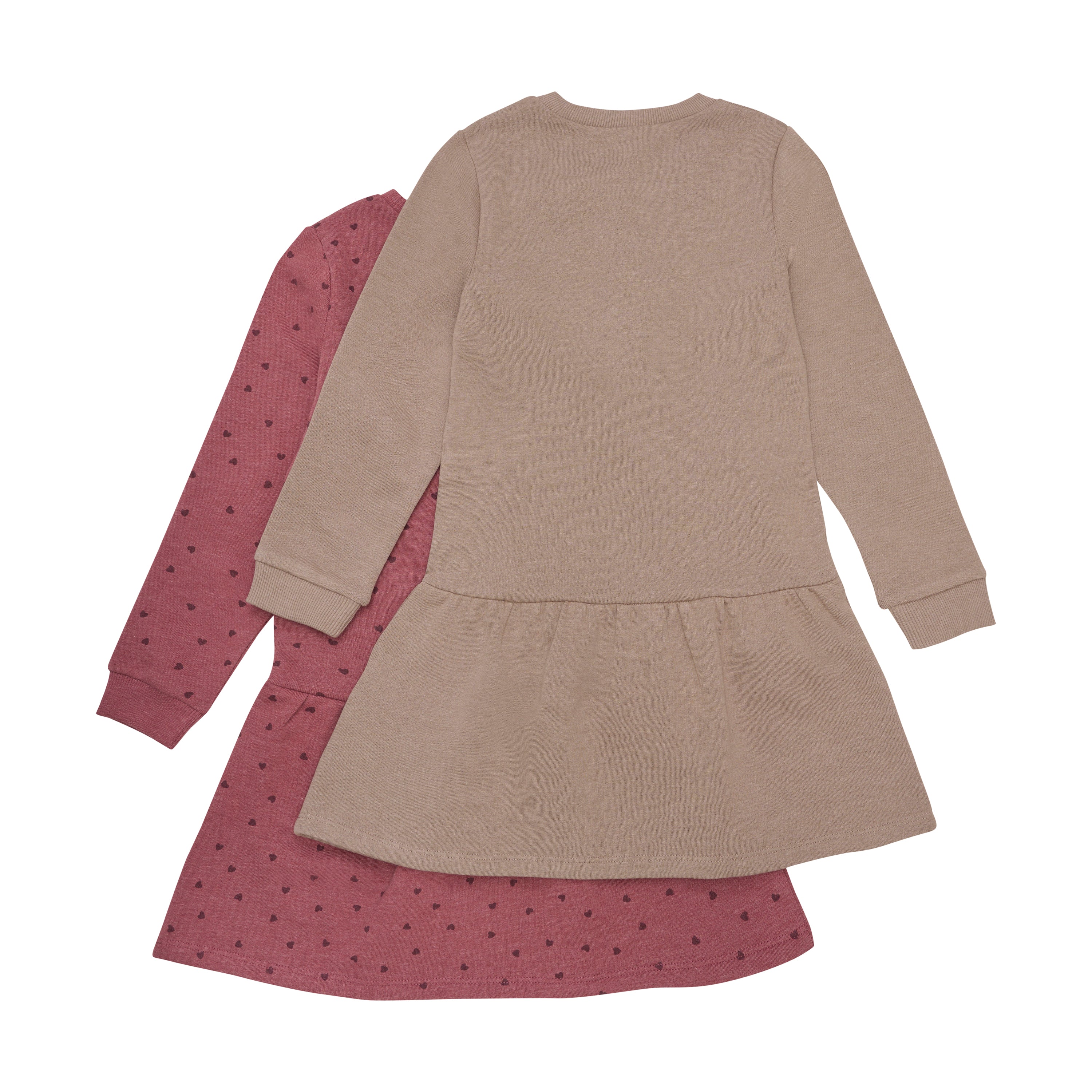Kjólar úr þykku og mjúku efni, koma tveir saman í sitthvorum litnum. Frábærir hversdagskjólar sem eru hlýjir og þægilegir - henta vel í skóla og leikskóla. Rykking neðarlega á kjólnum. Stroff á úlnliðum.