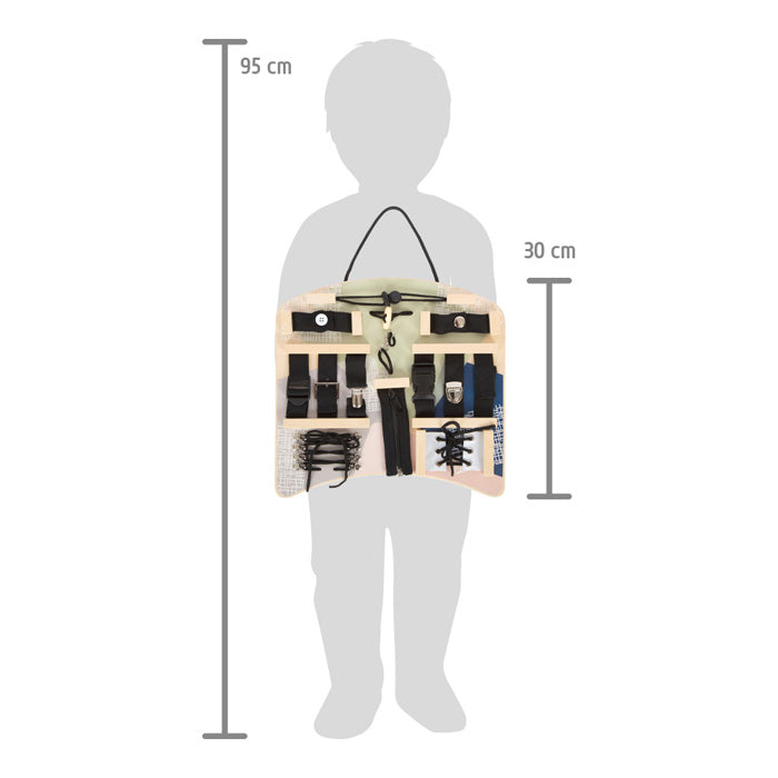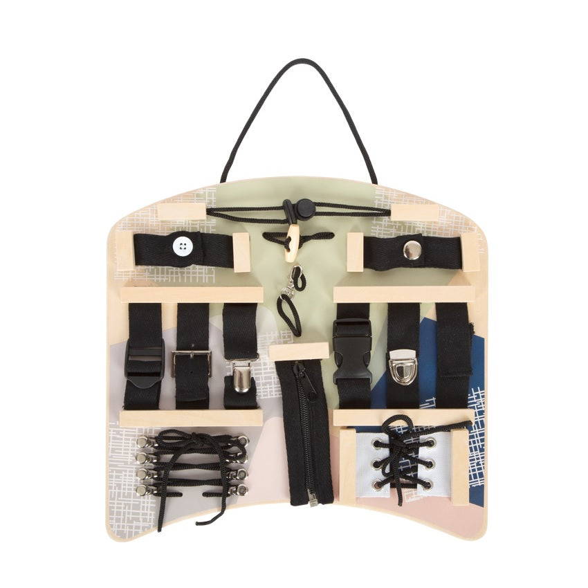 Þroskandi virkniborð sem býður upp á 14 mismunandi tegundir af hreyfivirkni með ýmis konar smellum og böndum. Leikfangið er innblásið af Montessori stefnunni og býður upp á fjölbreytt úrval af verkefnum úr daglegum athöfnum þar sem barnið þjálfar m.a. fínhreyfingar og samhæfingu við að binda, reima, renna, smella og krækja. Barnið getur dundað sér í þessu skemmtilega leikfangi í langan tíma og æfir á sama tíma mikilvæga færni fyrir daglegt líf .