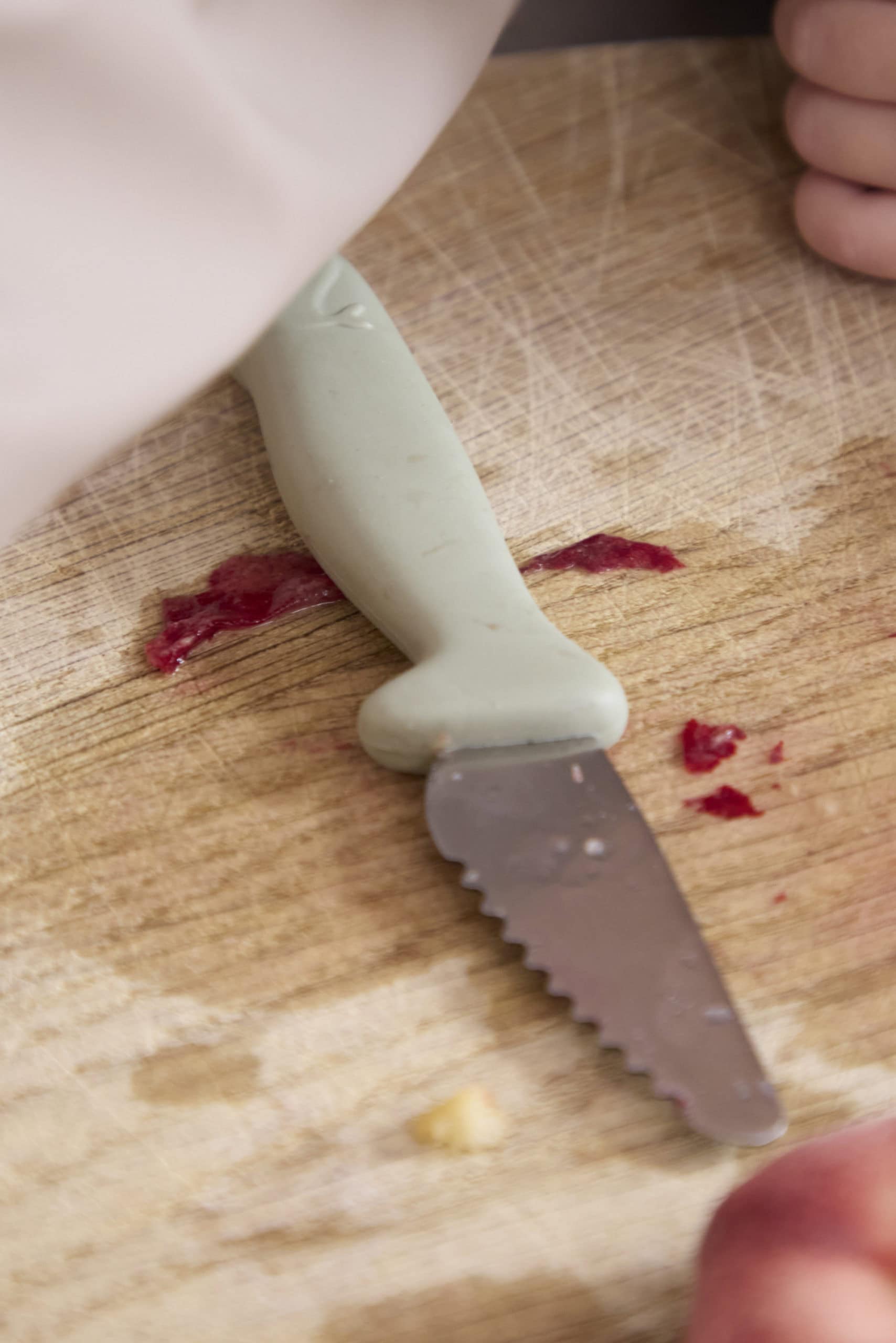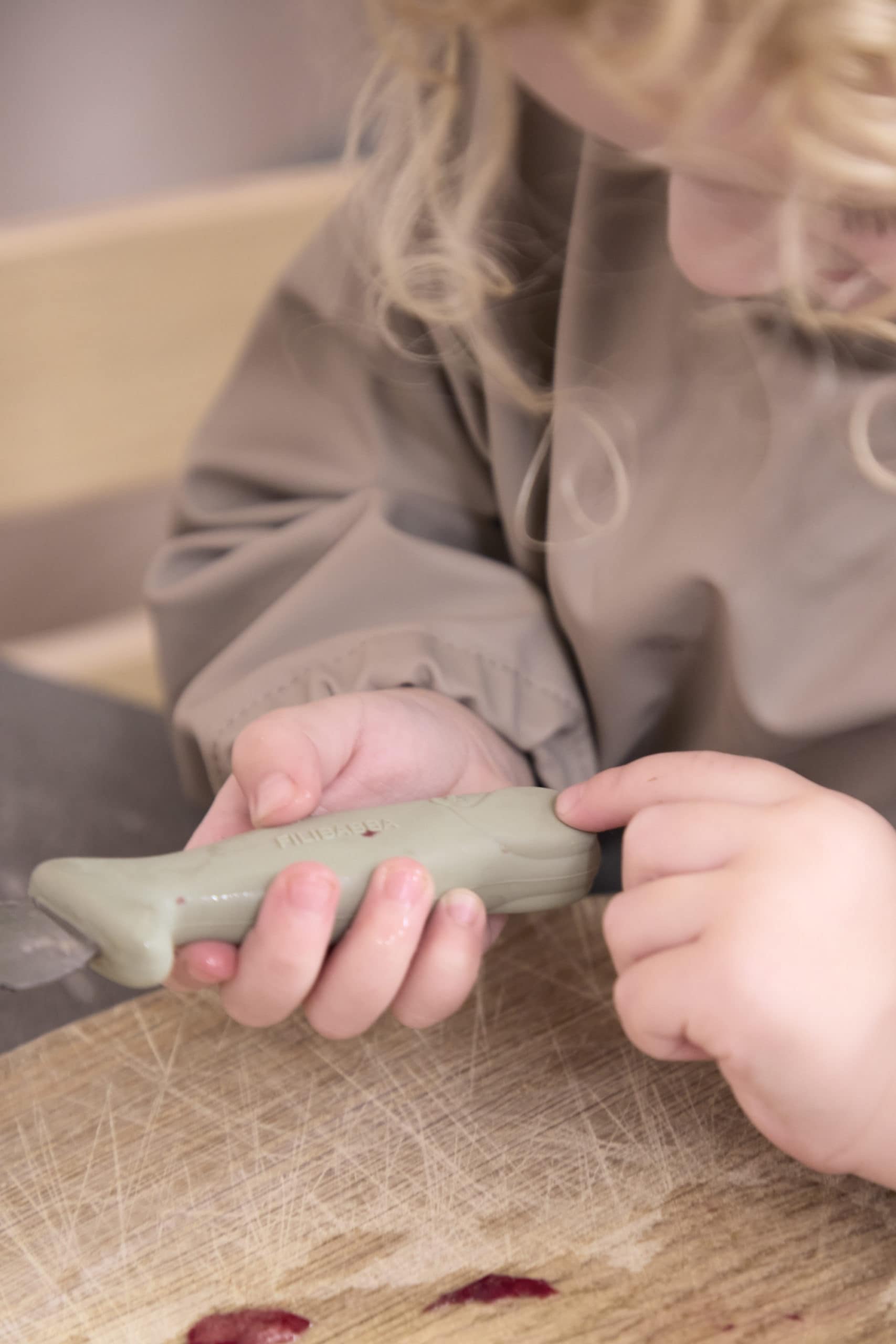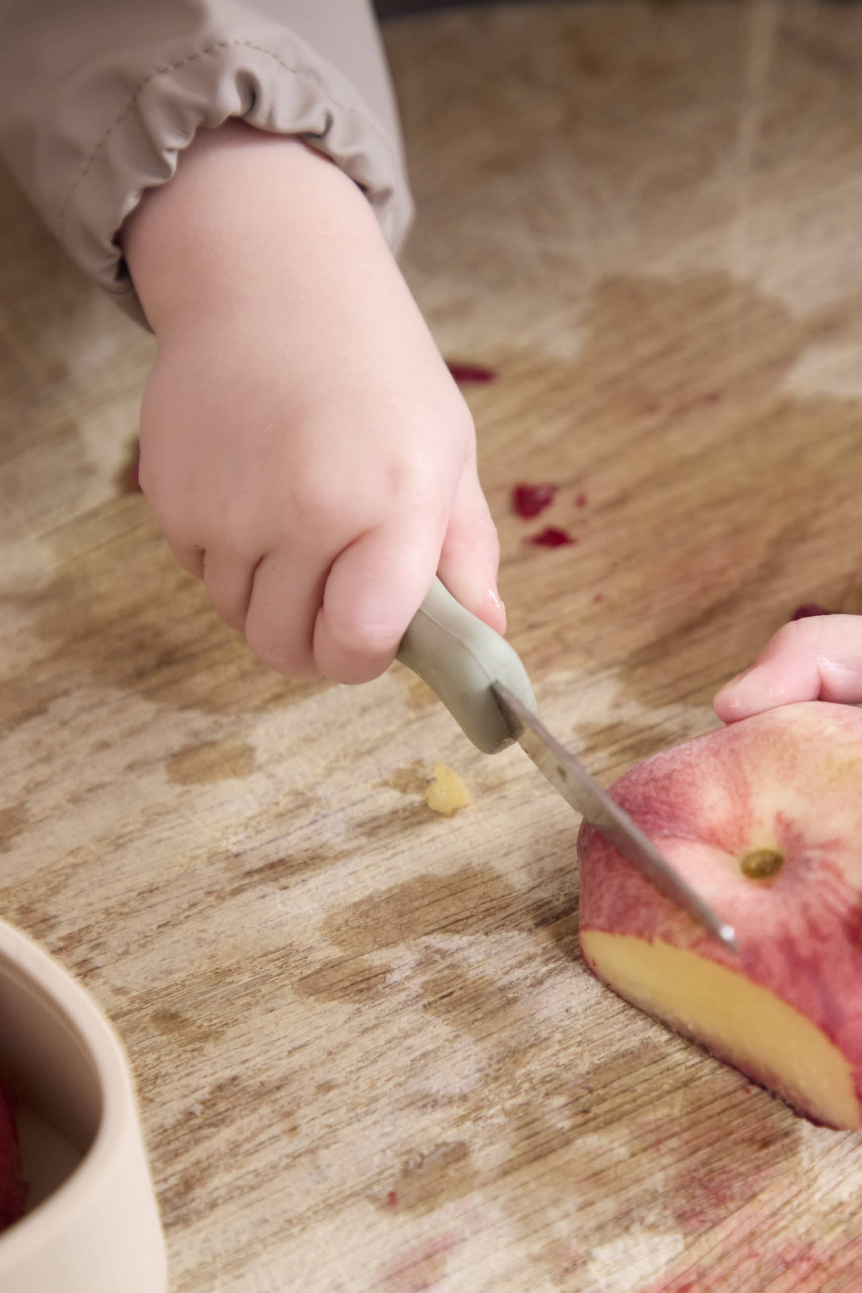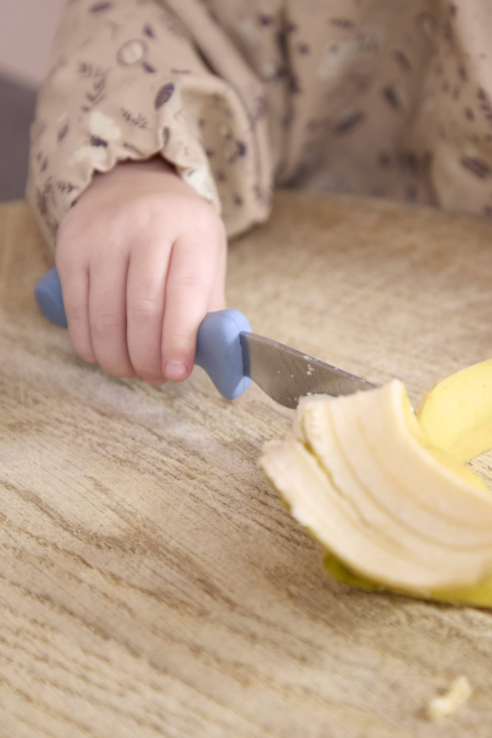 Þetta sett af byrjendahnífum inniheldur einn sléttan hníf og annan hníf með grófara blaði. Hnífarnir eru úr ryðfríu stáli með blaði sem getur m.a. skorið ávexti og grænmeti. Mjúka sílikonhandfangið er í hentugri lögun og stærð fyrir litlar hendur, handfangið er með öryggishindrun milli hnífablaðsins og fingranna.
