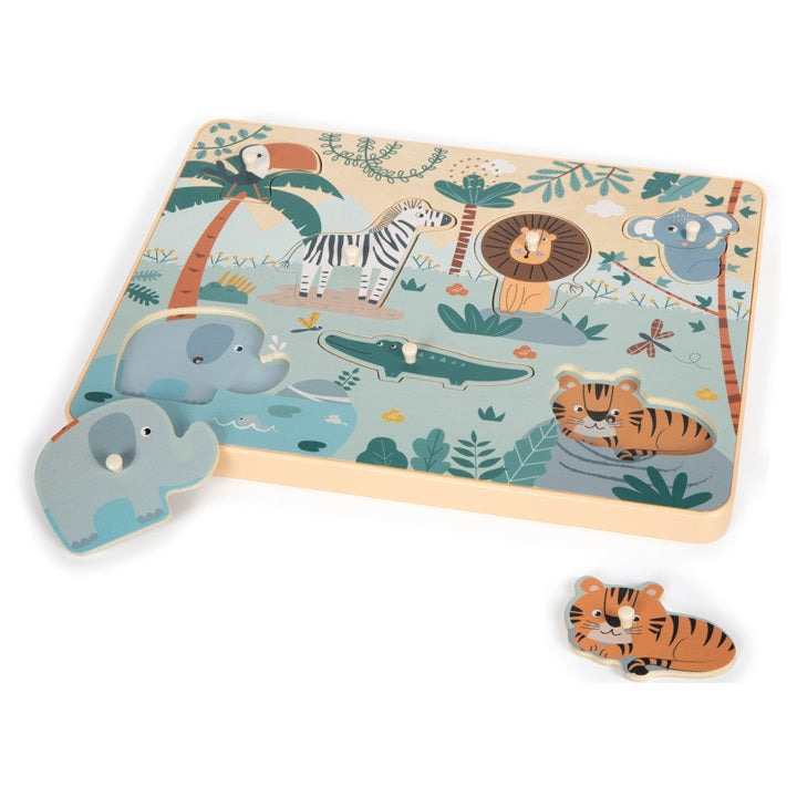 Skemmtilega myndskreytt viðarpúsl með dýrahljóðum. Þegar púslbitunum er lyft upp heyrast samsvarandi dýrahljóð, sem eflir skilningarvit barnanna og gerir leikinn meira spennandi. Púslið eflir fínhreyfingar, einbeitingu og skilning á orsökum og afleiðingum.