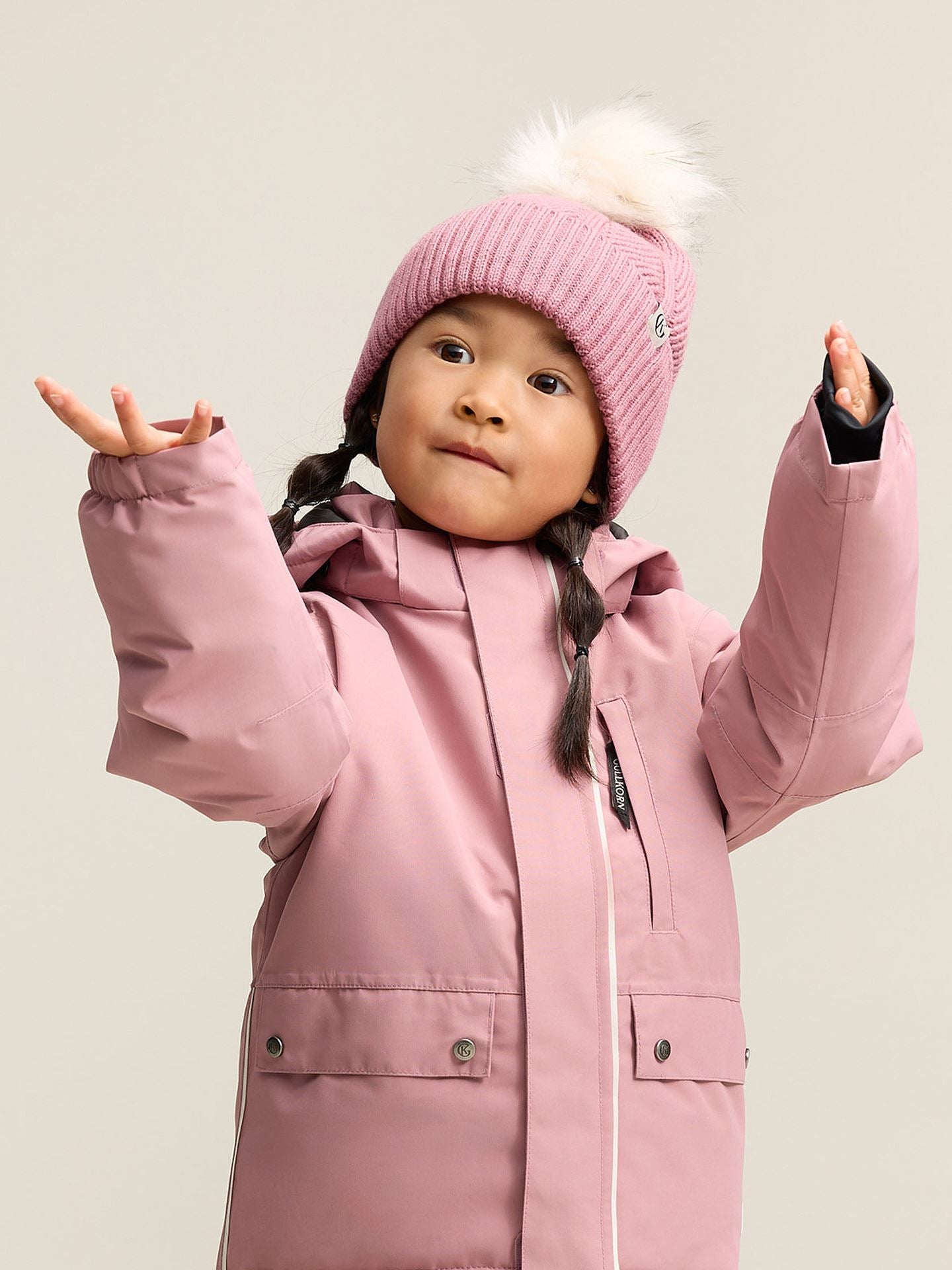Prjónuð ullarhúfa með föstu uppábroti og flísfóðruð að innan. Húfan er vindheld og hlý og því frábær í útiveruna í vetur. Húfan er með föstum gervidúski.