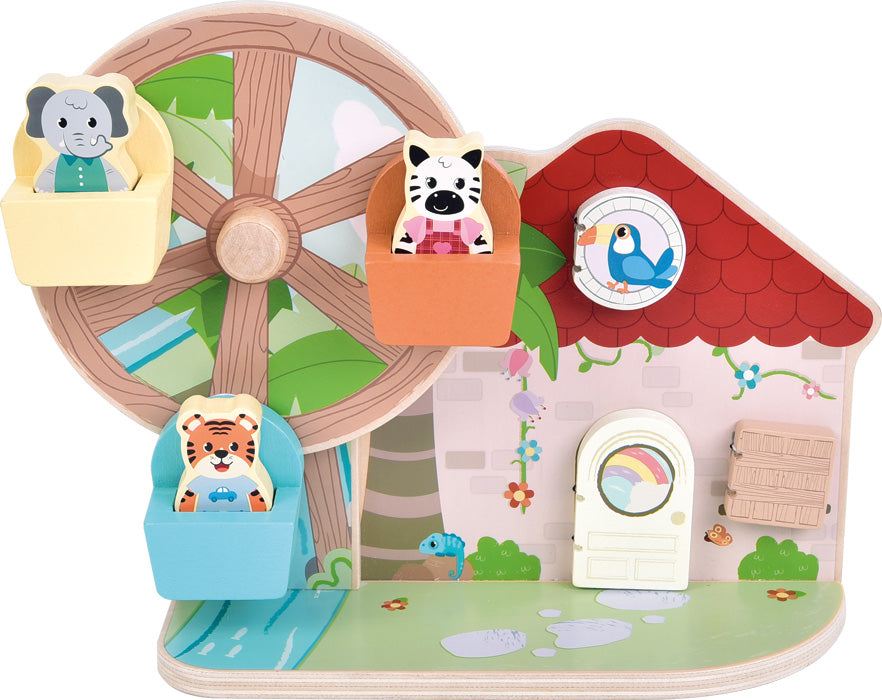 Parísarhjól úr við með þremur dýrum sem fara í skemmtilega parísarhjólaferð. Sömu dýramynstur bíða eftir að vera uppgötvuð á bak við þrjá litríka flipa á litla húsinu við hliðina. Sveifin að aftan gerir það auðvelt að snúa parísarhjólinu.