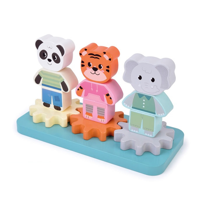 Þetta litríka stöflunarleikfang er úr FSC® vottuðum við og er skemmtileg leið fyrir barnið að æfa hreyfifærni og rökhugsun. Leikfangið er með þremur sætum frumskógardýrum, fíl, tígrisdýri og pöndu, sem staflast saman, og þarf barnið að raða þeim í réttri röð á tannhjólið. Þegar tannhjólinu er snúið byrja hinar tvær fígúrurnar einnig að hreyfast - heillandi áhrif sem gera samspil orsaka og afleiðinga áþreifanlegt. Skapandi formleikur með fræðandi gildi!