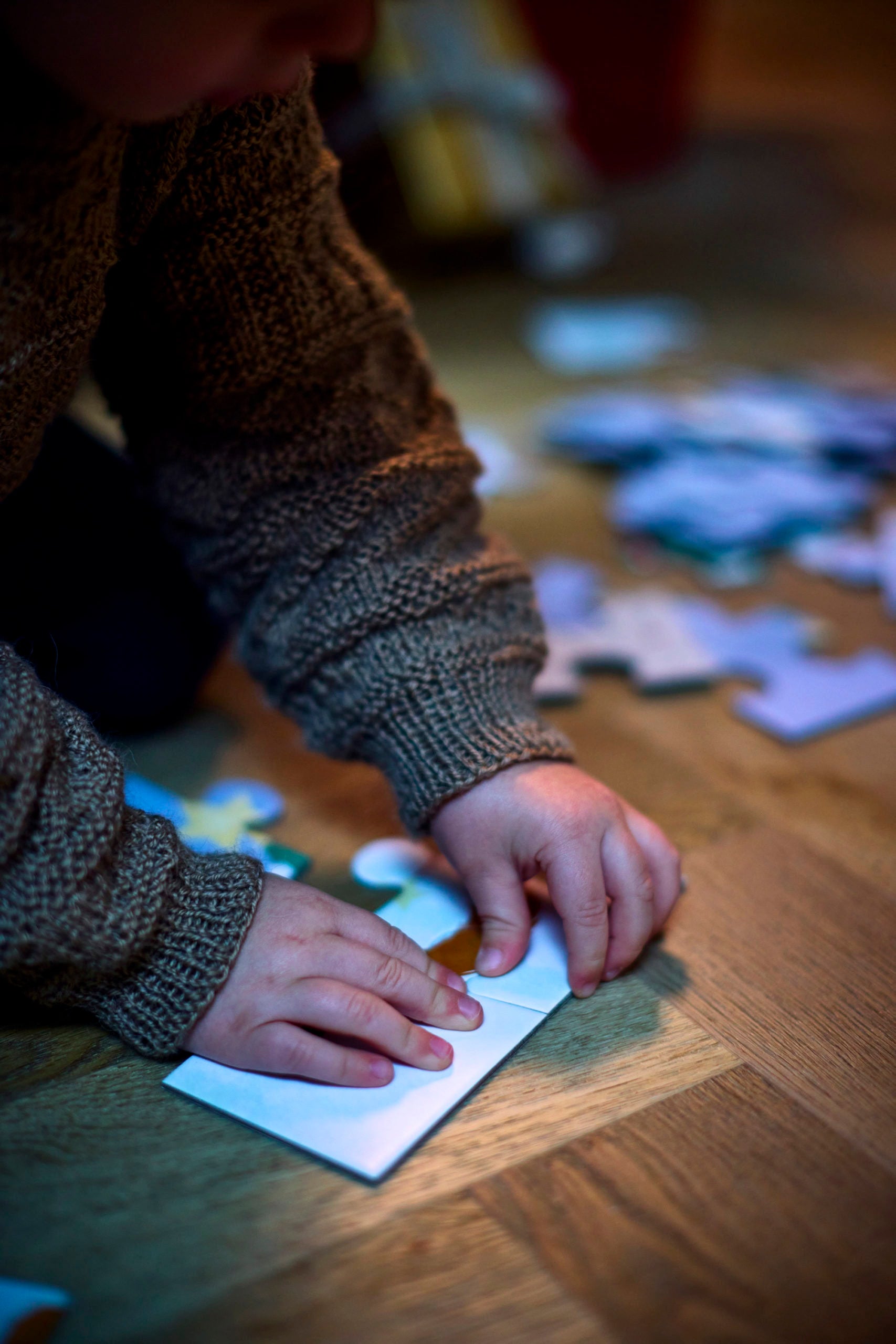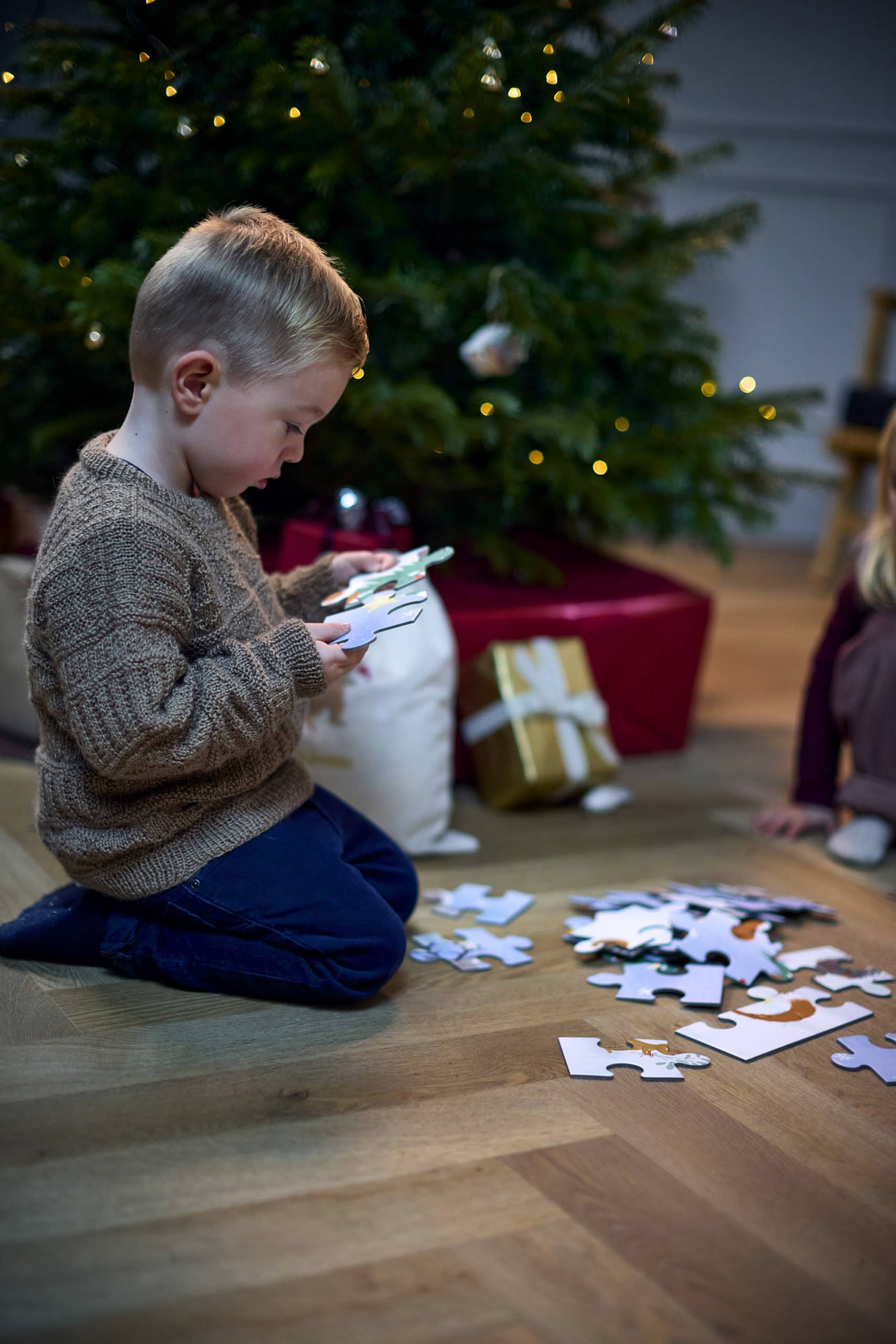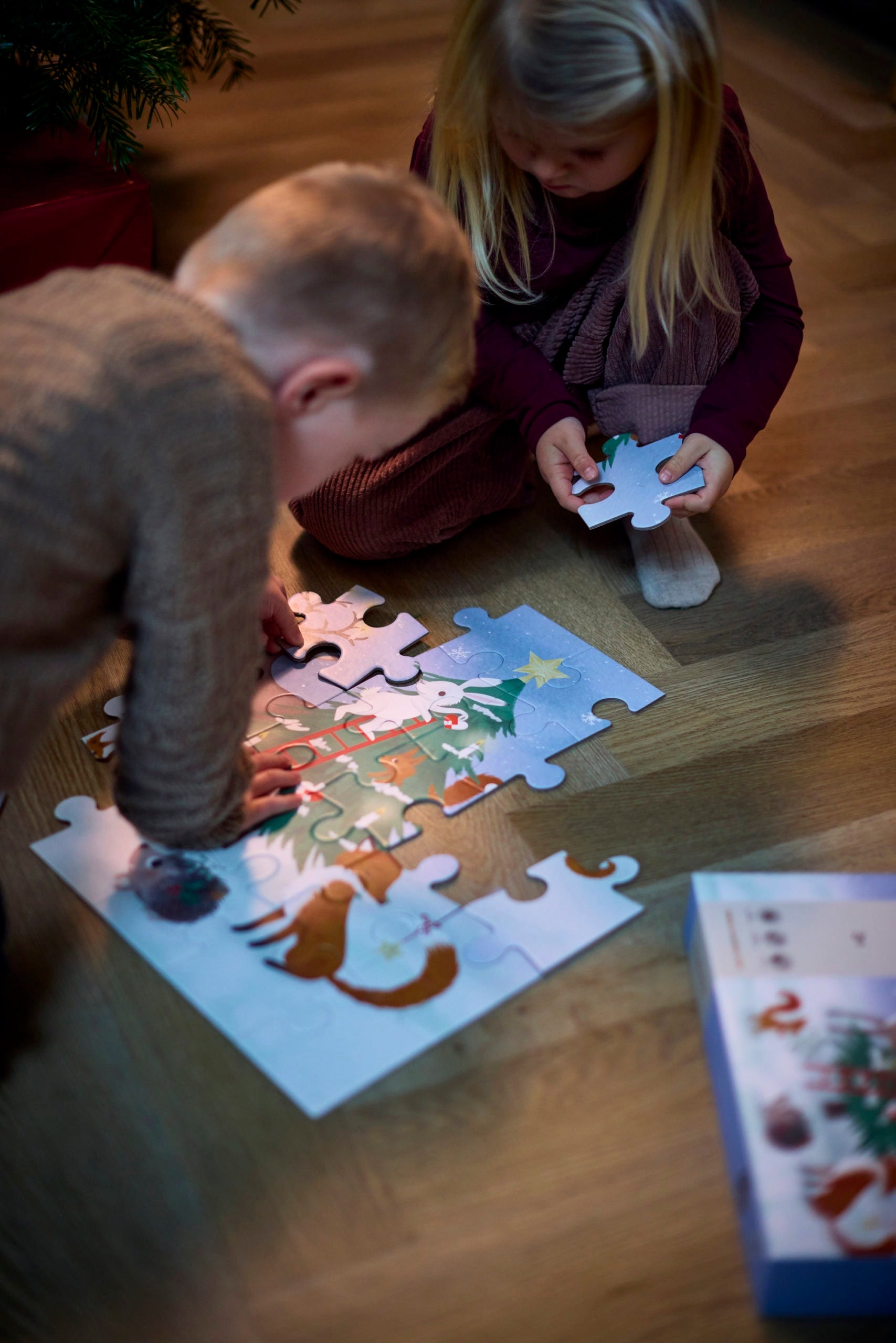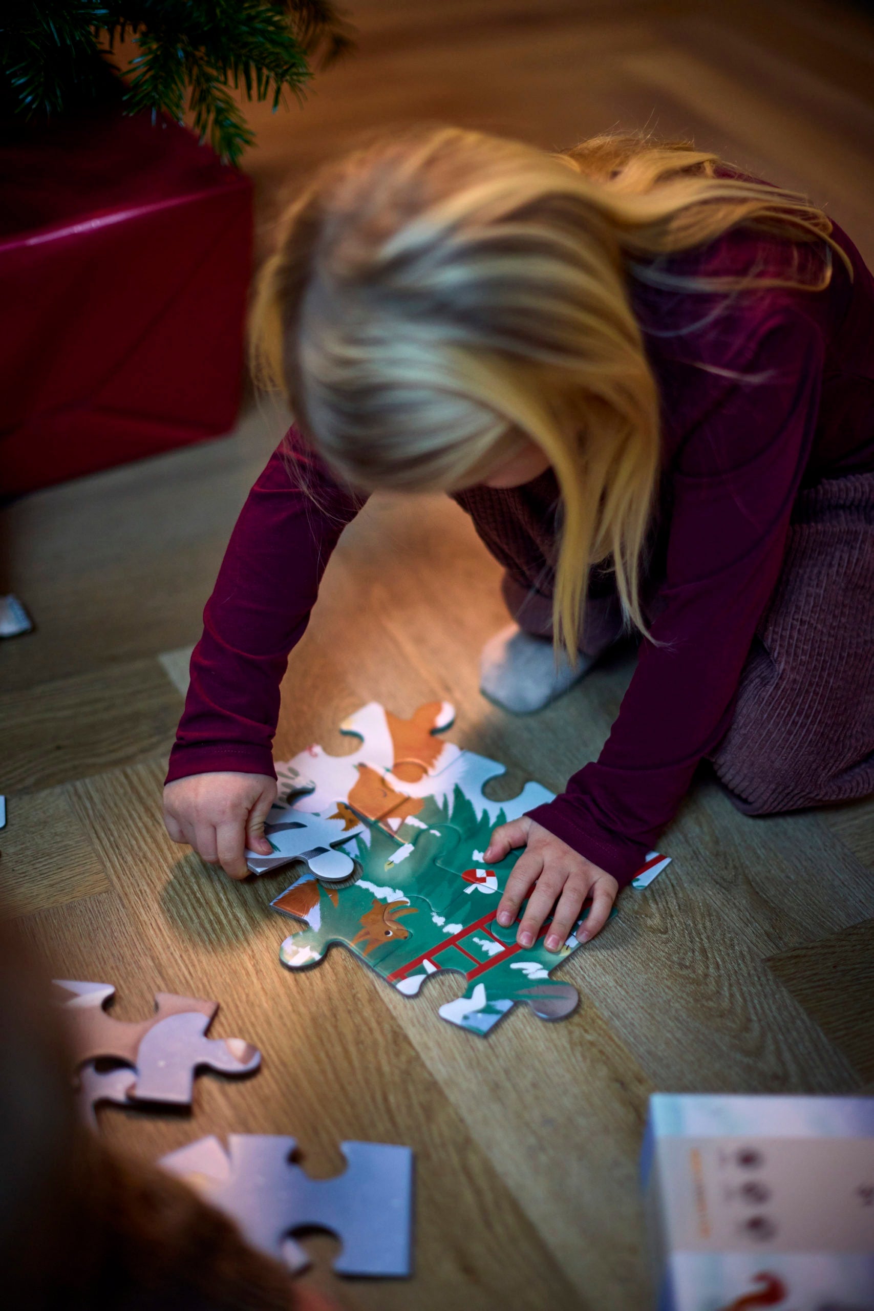 30 bita púsluspil með fallegri handteiknaðri mynd í vetrarþema sem sýnir glitrandi jólatré og vinaleg skógardýr. Púslið styrkir fínhreyfingar og hvetur til einbeitingar. Auðvelt er fyrir litlar hendur að grípa um bitana.
