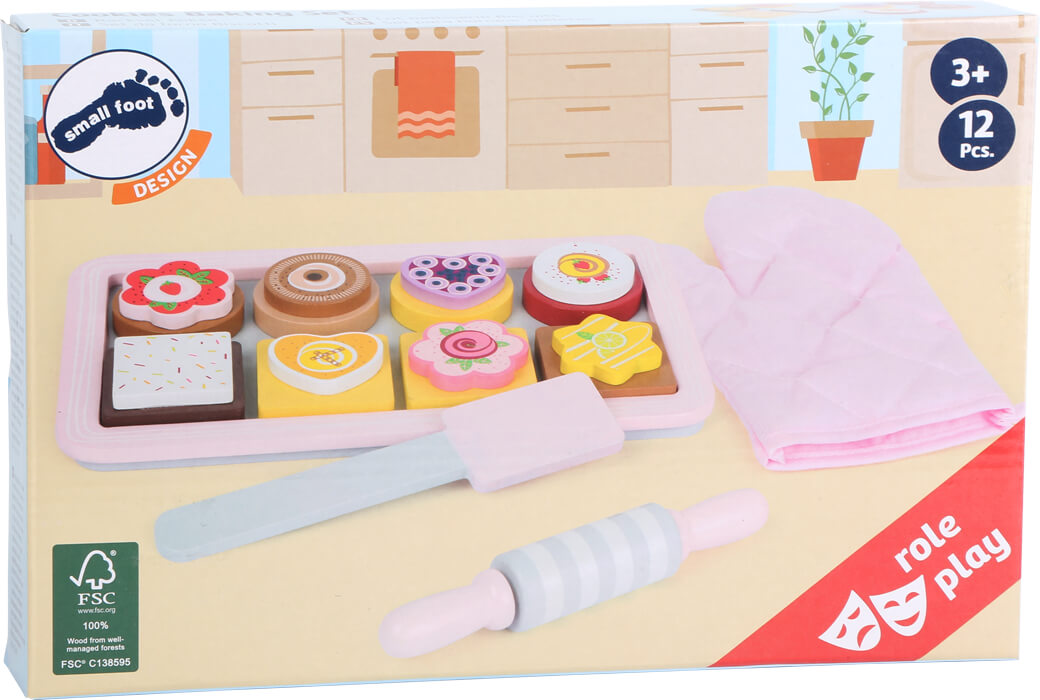 Litríkar trékökur á bökunarplötu sem hægt er að taka úr ofninum í leikfangaeldhúsinu með ofnhanska. Kökukefli og sleif fullkomna þetta fallega leiksett sem er úr 100% FSC® vottuðum við.